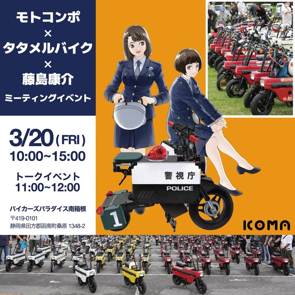ゲストに 漫画家でイラストレーターの藤島康介 さん、タタメルバイクの生駒タカミツ さんを迎え、「ホビーバイク/これからのモビリティ」をテーマに語り合う予定です。