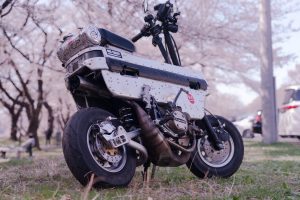 Specification エンジン:AIRSAL 70cc、メトラ製ヘッド キャブ:ヨシムラ製TM-MJM Φ22+デュアルスタックファンネル フォーム: DIO ステム:ワンオフステム ホイール:DJ1 タイヤ:ブリ […]